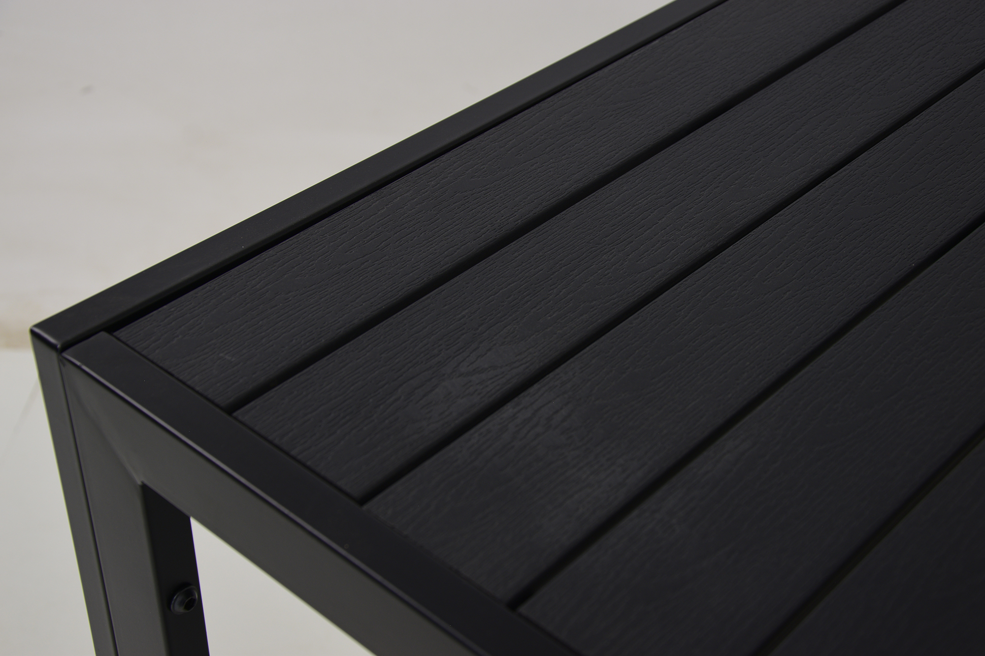 Nowoczesny i elegancki stół ogrodowy, który doskonale sprawdzi się na tarasie, w ogrodzie, na balkonie lub w strefie relaksu przy domu. Minimalistyczna forma w połączeniu z klasyczną czernią nadaje całości stylowy, ponadczasowy charakter, a solidne wykonanie gwarantuje komfort użytkowania przez wiele sezonów.