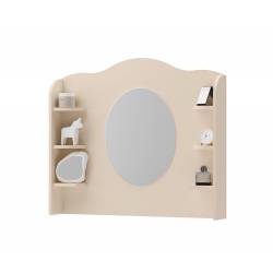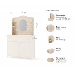 Centralnym elementem toaletki jest lustro, które zapewnia komfort podczas codziennej pielęgnacji i wykonywania makijażu. Po obu stronach lustra znajdują się praktyczne półeczki, idealne do przechowywania kosmetyków, perfum oraz drobnych akcesoriów, dzięki czemu wszystko jest zawsze pod ręką.