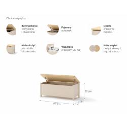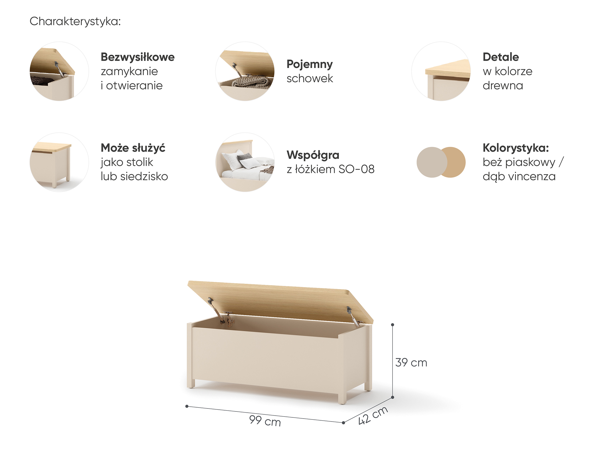 Wielofunkcyjna skrzynia–kontener w eleganckim zestawieniu kolorystycznym beż piaskowy / dąb Vincenza bielona to praktyczny i stylowy element wyposażenia wnętrza. Jej minimalistyczna forma sprawia, że doskonale wpisuje się zarówno w nowoczesne, jak i klasyczne aranżacje.