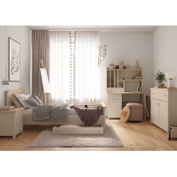 Połączenie subtelnego beżu z naturalnym odcieniem bielonego dębu nadaje meblowi lekkości i przytulnego charakteru. Stabilna konstrukcja gwarantuje trwałość i komfort codziennego użytkowania.