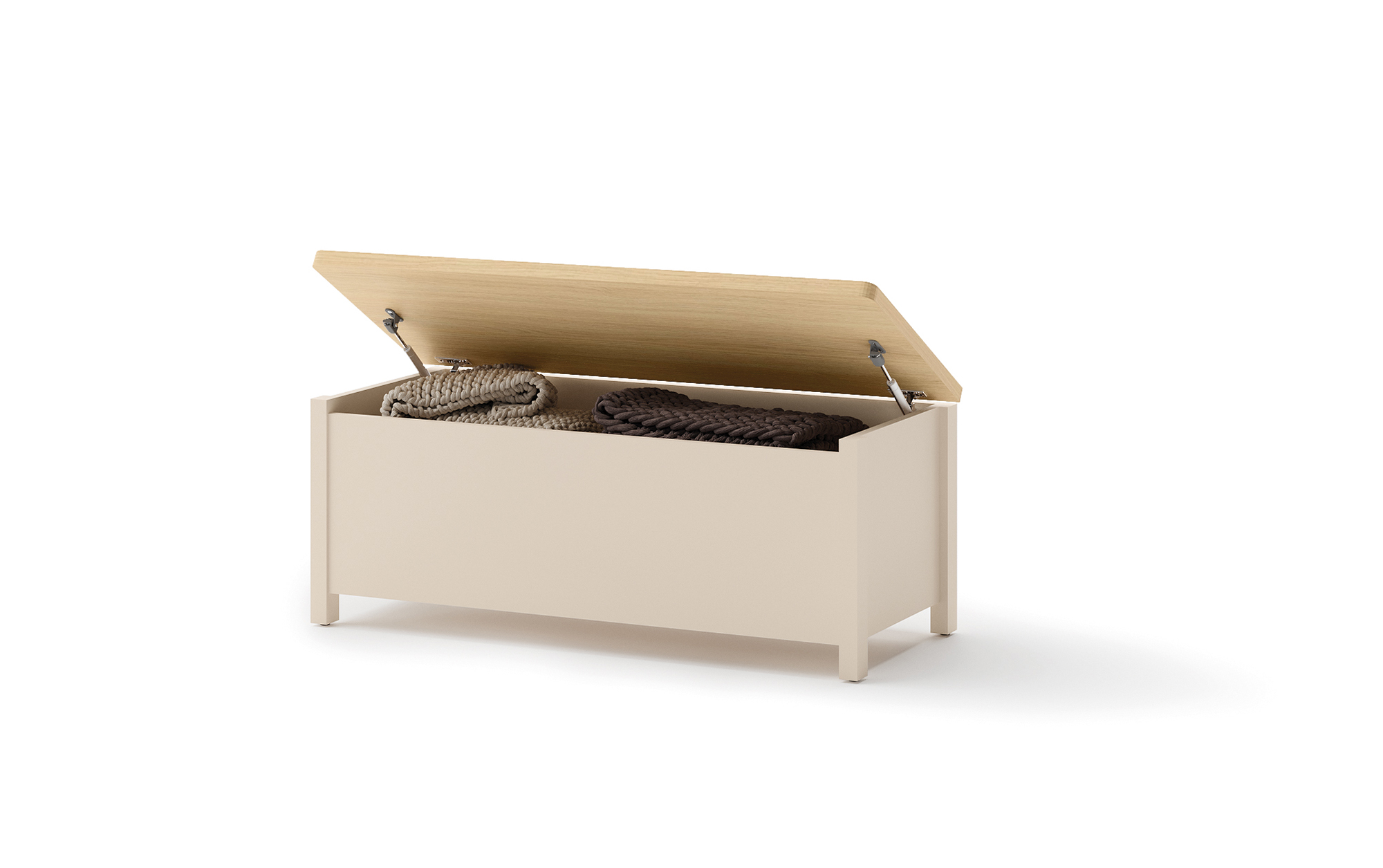 Skrzynia została zaprojektowana z myślą o wygodnym przechowywaniu – sprawdzi się idealnie do przechowywania koców, poduszek, zabawek czy innych domowych drobiazgów. Podnoszona pokrywa z solidnymi zawiasami umożliwia łatwy dostęp do wnętrza, a jednocześnie zapewnia bezpieczne użytkowanie.